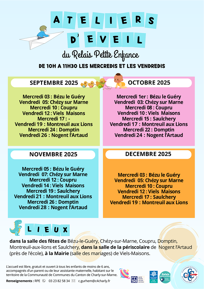 L’accueil à ces ateliers est libre, gratuit et ouvert à tous les enfants de moins d 6 ans, accompagnés d’un parent ou de son assistante maternelle, habitant sur le territoire intercommunal du Canton de Charly sur Marne.