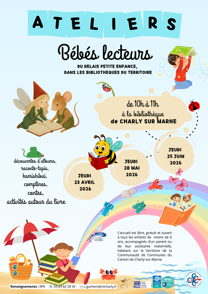 Calendrier des ateliers Bébés Lecteurs - 2026 trimestre 2, à la bibliothèque de Charly sur Marne